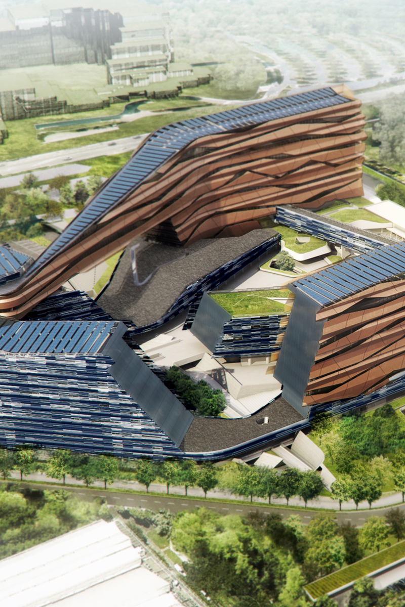 The image of the ENI Headquarters in San Donato Milanese clearly conveys the iconic and systemic strength of the project: an articulated complex of fluid volumes, developed horizontally and connected to each other, which are organized around a large central void, the square, the true symbolic and spatial heart of the intervention. The three office towers do not impose themselves as isolated objects, but dialogue with each other and with the surrounding green landscape, building a continuous relationship between architecture, public space and urban infrastructure. In this context, light plays a decisive role in making the formal complexity of the whole legible and in ensuring comfort, orientation and perceptive quality to the workspaces.