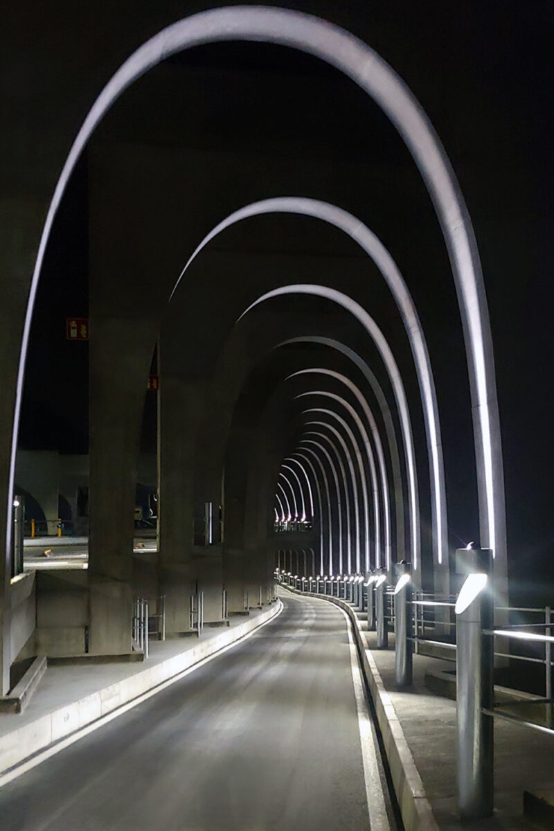 The image of Terminal 1 of Barcelona – El Prat Airport immediately conveys the spatial strength of the architecture: a large continuous hall, punctuated by a regular structure and an extended roof that seems to float above the ground. Artificial light makes a decisive contribution to this perception of clarity and continuity, distributing itself evenly and diffusely, without creating points of visual tension or arbitrary hierarchies. Reflective surfaces on the floor amplify the feeling of openness, while signage and information devices emerge with functional precision, readable from a great distance. In this context, the lighting is neither spectacular nor iconic, but builds a stable field of vision, which is essential for orientation, safety and comfort for millions of passengers.