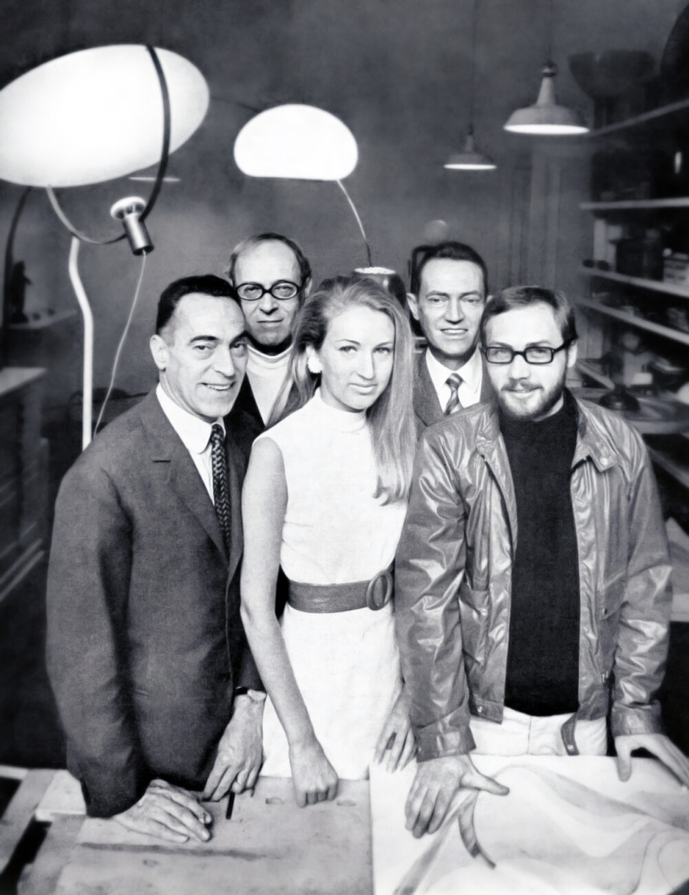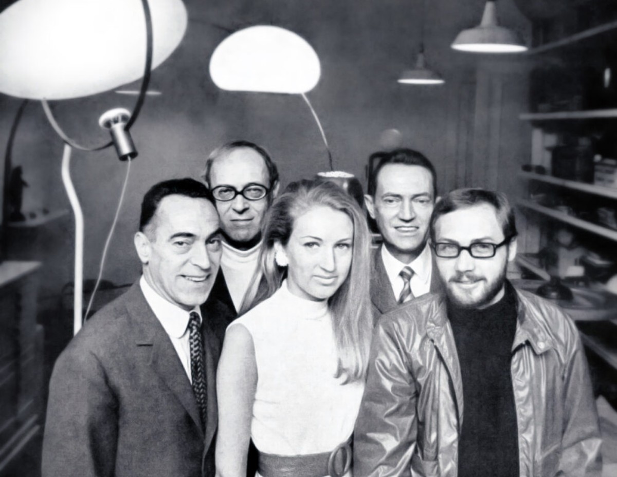 Milan, 1968 – In their studio in Piazza Castello, from left: architects Achille Castiglioni, Livio Castiglioni, Giorgina Castiglioni, Pier Giacomo Castiglioni, and Piero Castiglioni. A rare family portrait that captures three generations of designers, key figures in the birth of Italian design and the culture of lighting.