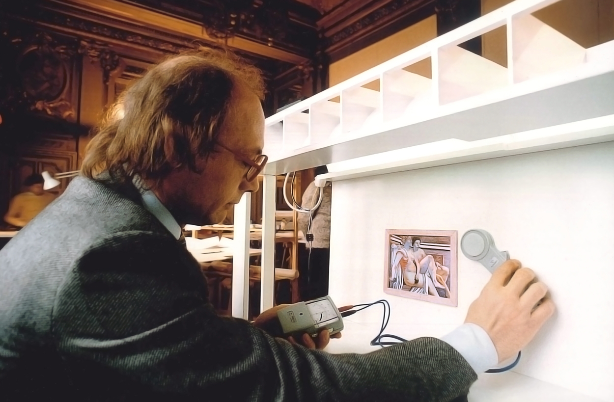 Piero Castiglioni checks the illuminance values for the exhibition walls in the test model for the Musée d’Orsay, in the early 1980s.