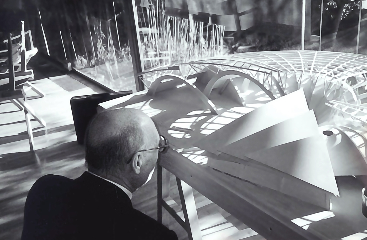 Italy, San Giovanni Rotondo, 2004 – Piero Castiglioni observes the model of the Sanctuary of Saint Pio of Pietrelcina, designed by architect Renzo Piano. A complex and symbolic work, in which architecture, light, and spirituality merge into a single vision.