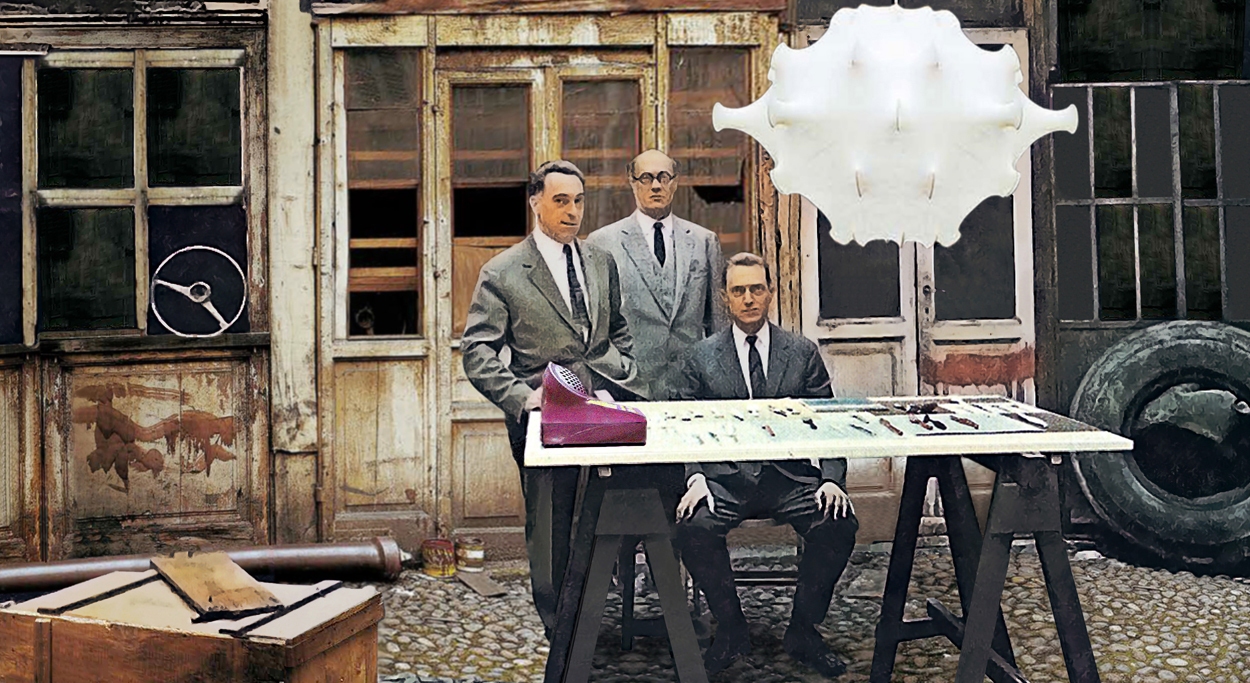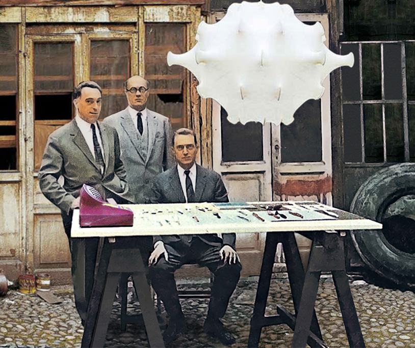 In Evaristo Fusar's famous 1961 photograph, the three brothers are portrayed in the courtyard of their Porta Nuova studio, behind a worktable with some of their early prototypes. Above, the Cocoon Taraxacum lamp, recently designed for Flos, softly illuminates their faces.
