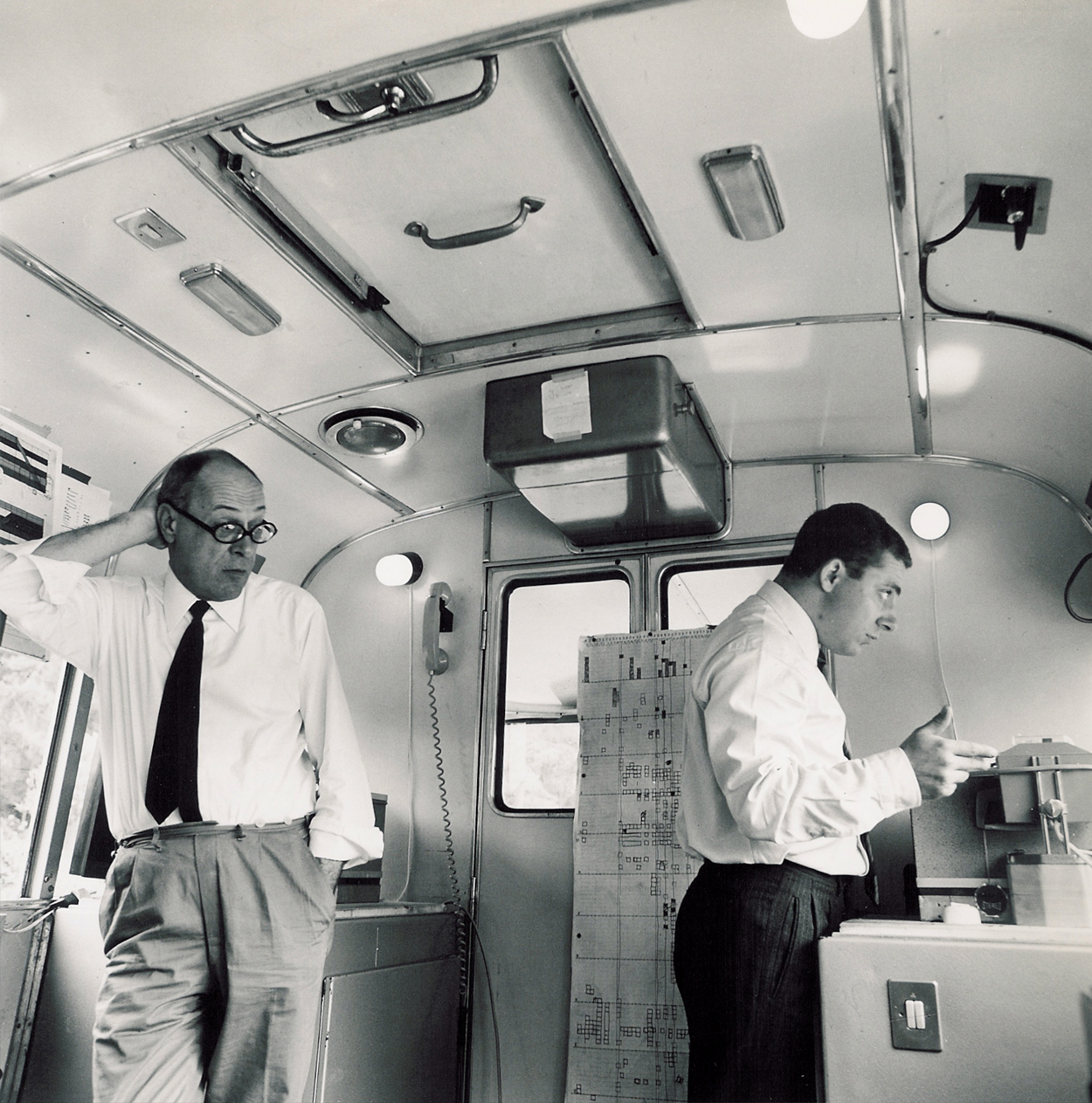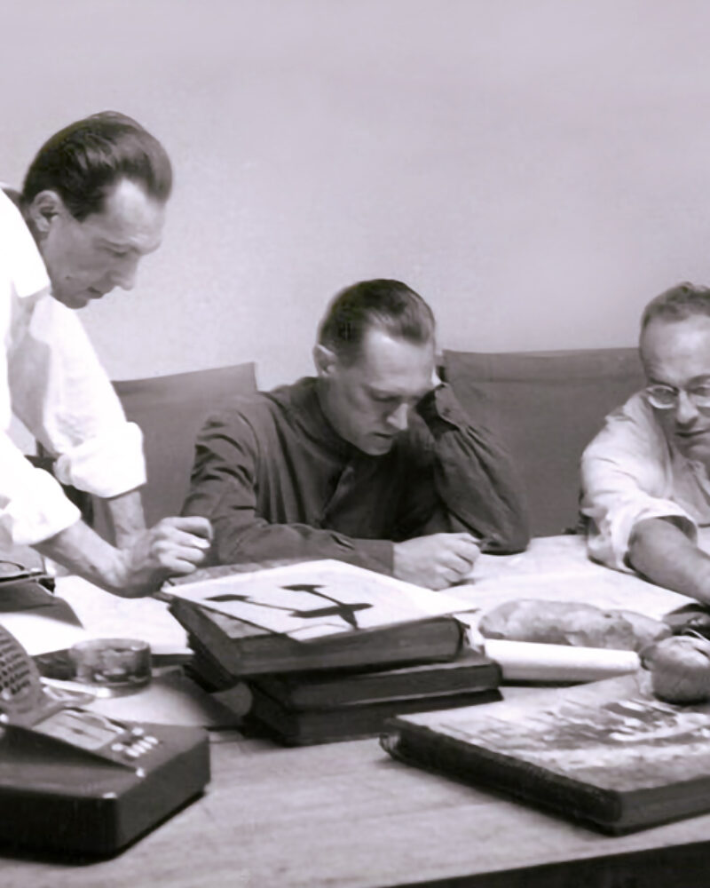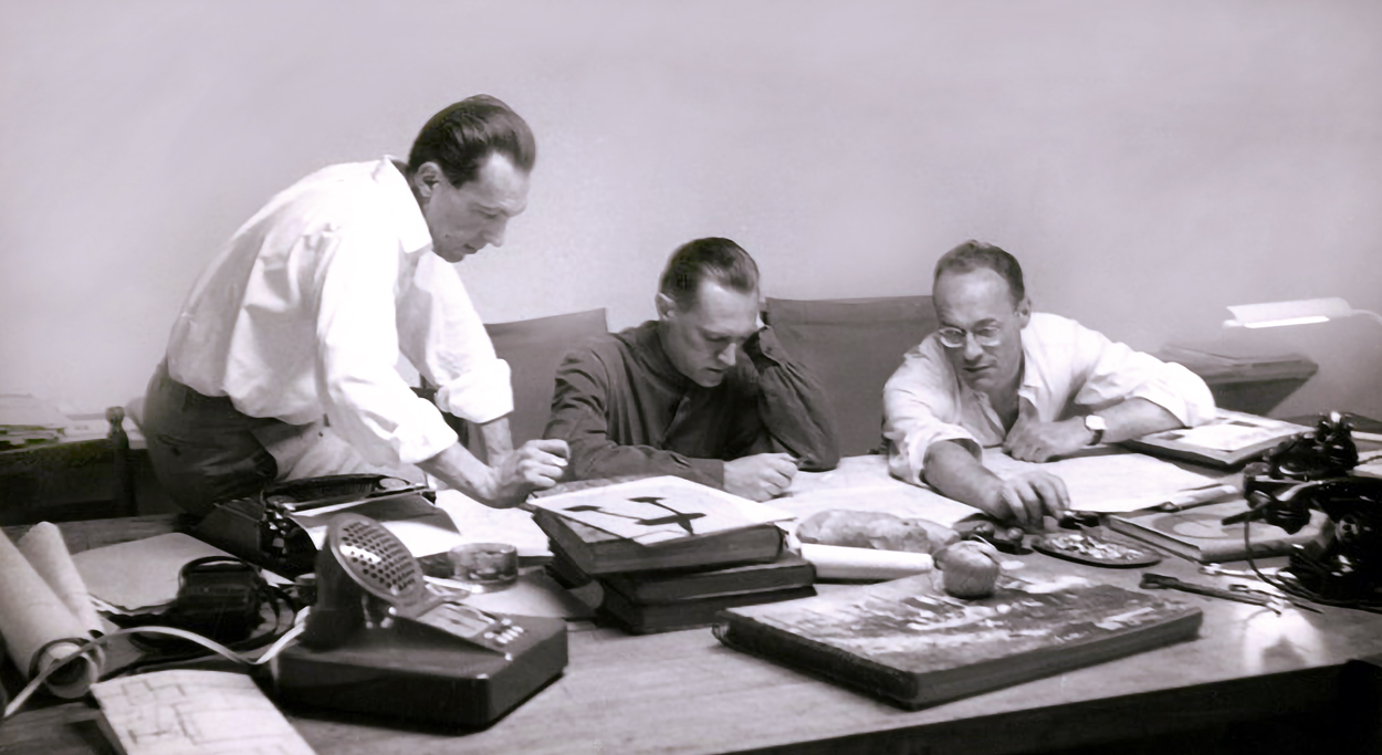 Milan, 1952 – Achille, Pier Giacomo, and Livio Castiglioni in their Porta Nuova studio. The image conveys the intense and industrious atmosphere of their shared method, founded on experimentation, direct comparison, and the integration of design, technology, and the artist's vision.