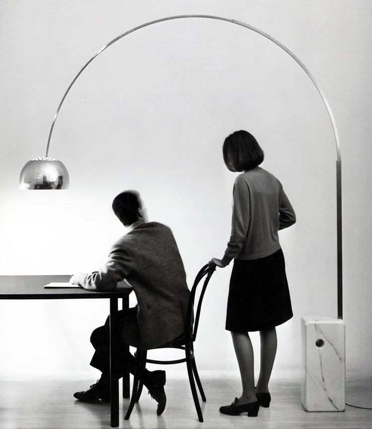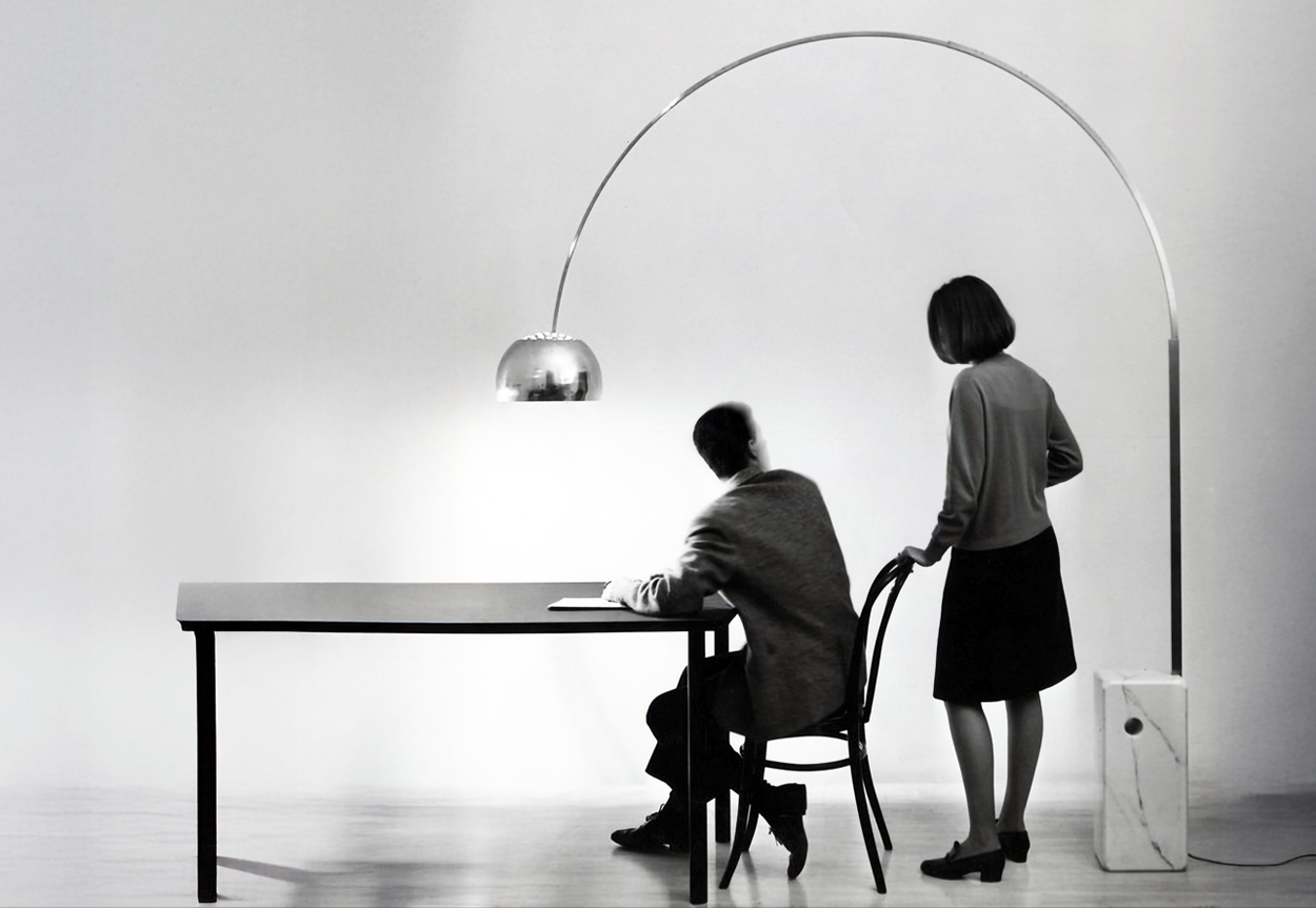 Among the most emblematic is the Arco lamp (1962), designed by Achille and Pier Giacomo for Flos, inspired by street lamps and conceived to illuminate a table without the bulk of a ceiling lamp: the steel arch and the solid Carrara marble base represent a perfect balance between function and material. The Taccia (1958-1962), also for Flos, was born from a provocative idea: an inverted diffuser that acts as a reflector, returning an indirect and sophisticated light. The Toio (1962), a hybrid between a car headlamp and a minimal structure, embodies the poetics of functional reuse, just as the Luminator (1954), awarded the Compasso d'Oro, stands out for its essential form and technical innovation in the cooling of the source. Also of great importance is the Lampadina (1972), which deliberately exposes the luminous element, making fun of the lamp-object; Fuchsia (1996), later created by Achille alone, represents a mature reflection on the luminous effect and formal lightness.