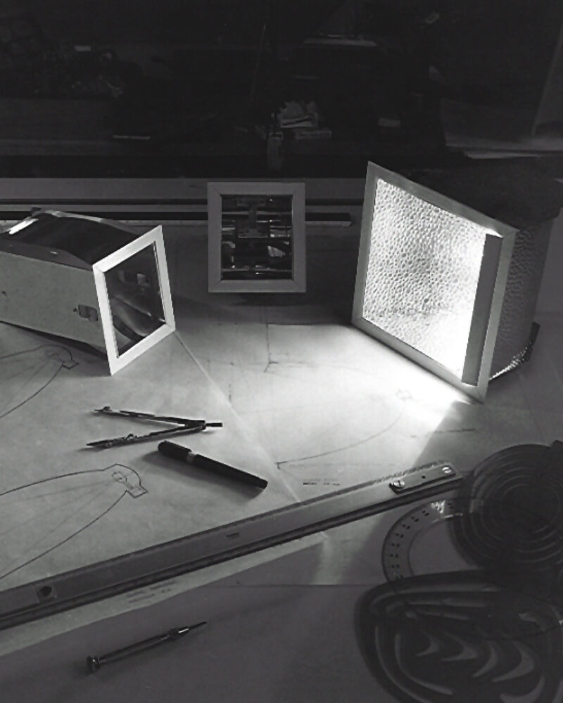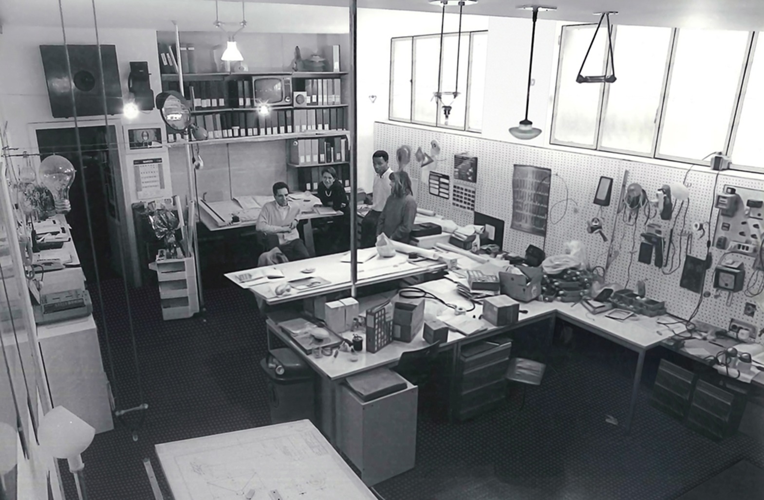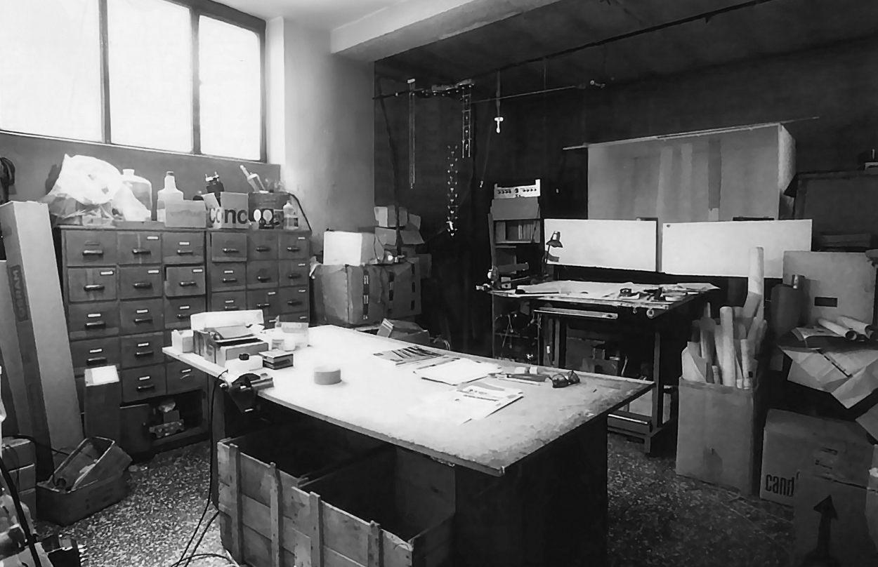 Milan, 1988 – Interior of Piero Castiglioni's studio on Via Presolana. A place of technical and design experimentation, where lighting intertwines with research into materials, light sources, and optical solutions. Among drawing boards, prototypes, and measuring instruments, a rigorous and interdisciplinary working method takes shape, destined to profoundly impact the evolution of Italian lighting design.