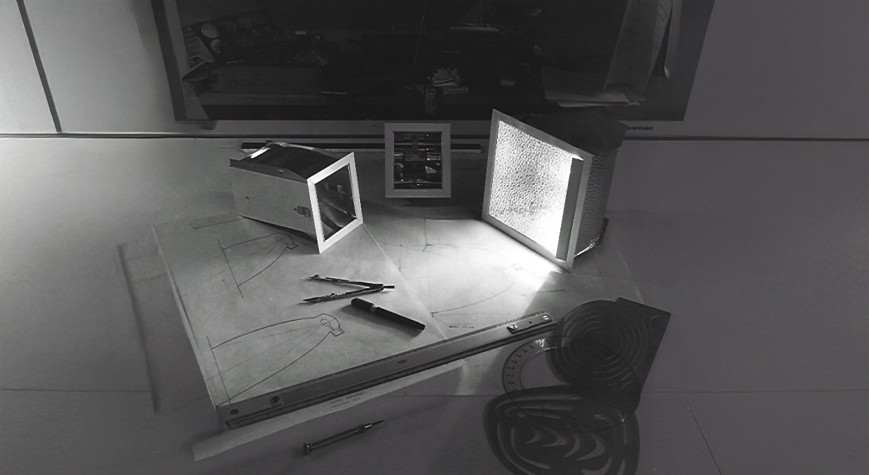 Study and prototype of a lighting fixture made specifically for the Musée National d’Art Moderne, Centre Georges Pompidou in Paris (1982–1985). On the workbench, technical drawings, tracing tools, and optical components highlight the integrated process between architectural design and lighting research conducted by Piero Castiglioni.