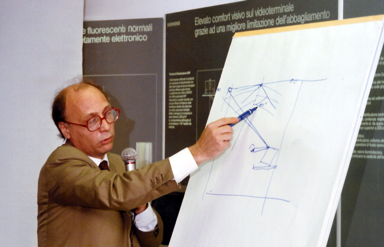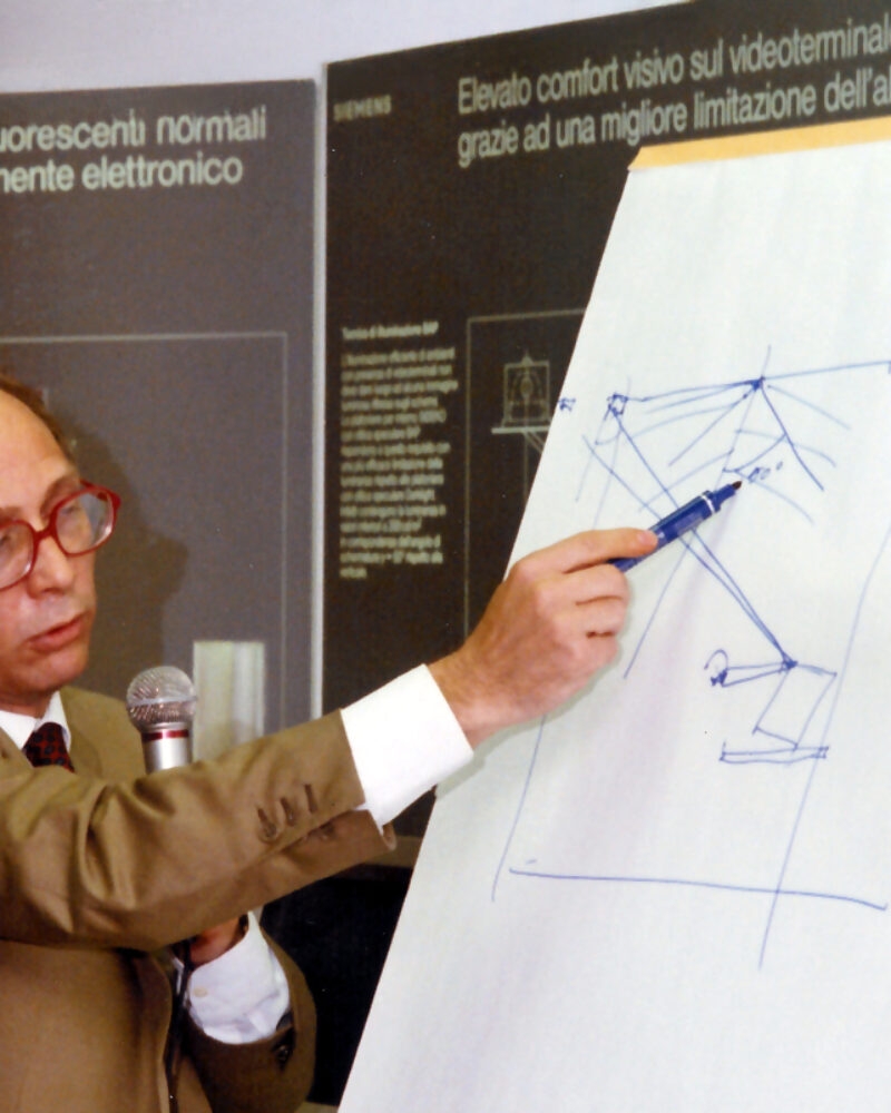 Piero Castiglioni al convegno Siemens del 1985. Durante l’intervento, illustra concetti legati al progetto della luce, sottolineando l’importanza dell’integrazione tra aspetti tecnici e spaziali nell’illuminazione architettonica.