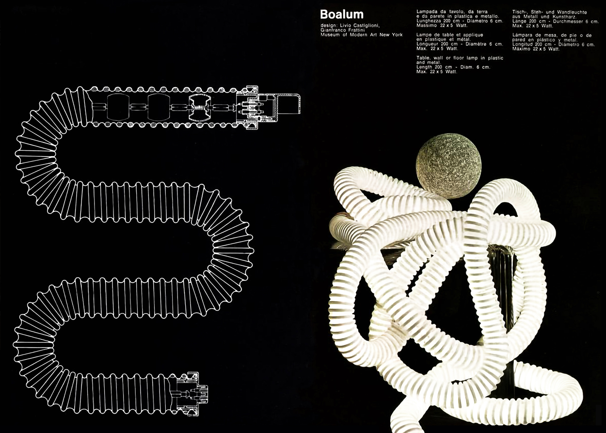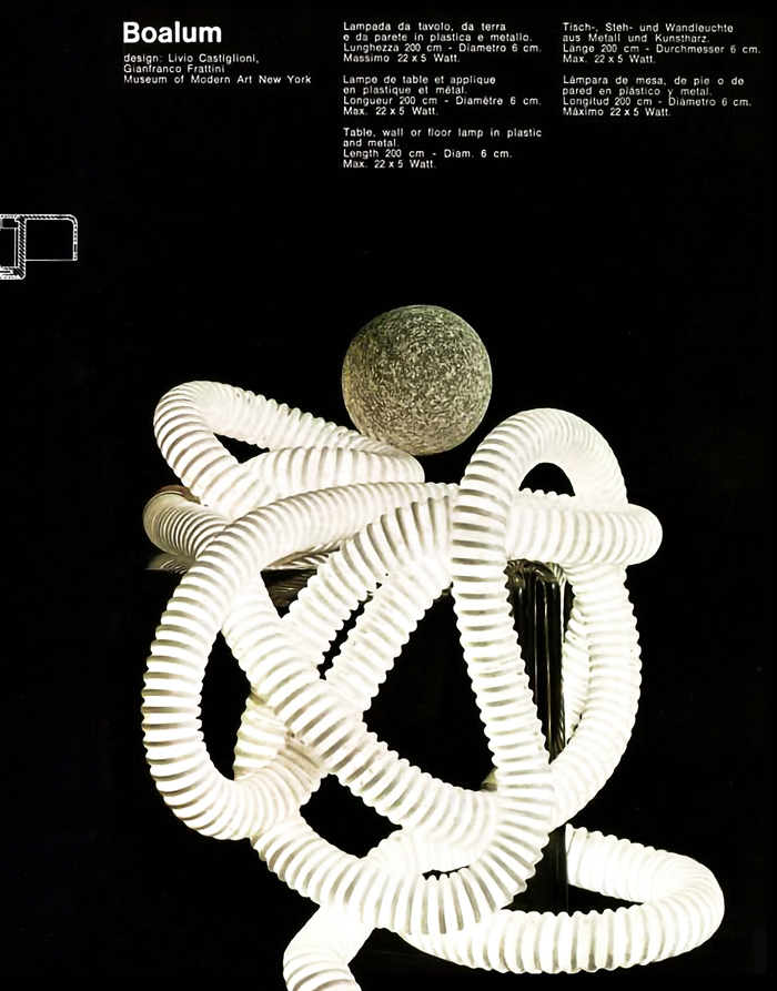 Boalum, a lamp designed by Livio Castiglioni and Gianfranco Frattini in 1970 for Artemide, presented here in the 1973 catalog, is an emblematic example of formal and technological experimentation. Composed of a flexible translucent plastic body containing a series of modular light sources, it can be freely shaped, becoming a table, floor, or wall lamp. Light and matter merge into a seamless device, playful and innovative in spirit, which pioneered the logic of relational design. Included in the collections of the Museum of Modern Art in New York, it represents one of the most radical objects of Italian design of the 1970s.