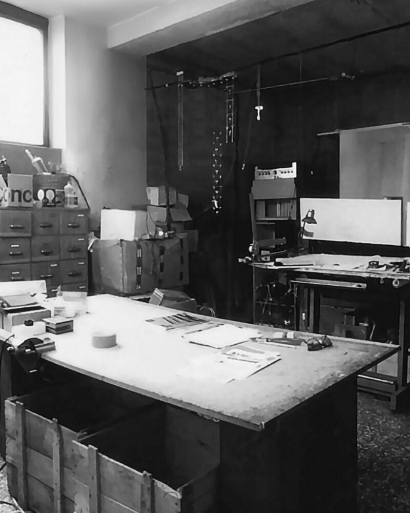 The workshop on Via Presolana in 1979, the operational and creative heart of the Castiglioni studio: an artisanal environment where materials, prototypes, technical drawings, measuring instruments, and electrical components coexist.
