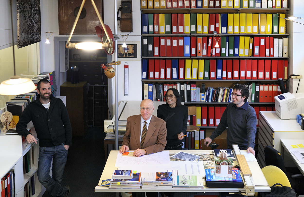 The laboratory on Via Presolana in 2014, fifty years after its founding: around the work table, architect Piero Castiglioni, with his collaborators Chiara Baldacci, Marco Petrucci, and Mauro Zani, testifies to the continuity of a studio that is both a design workshop and a place for the transmission of knowledge.