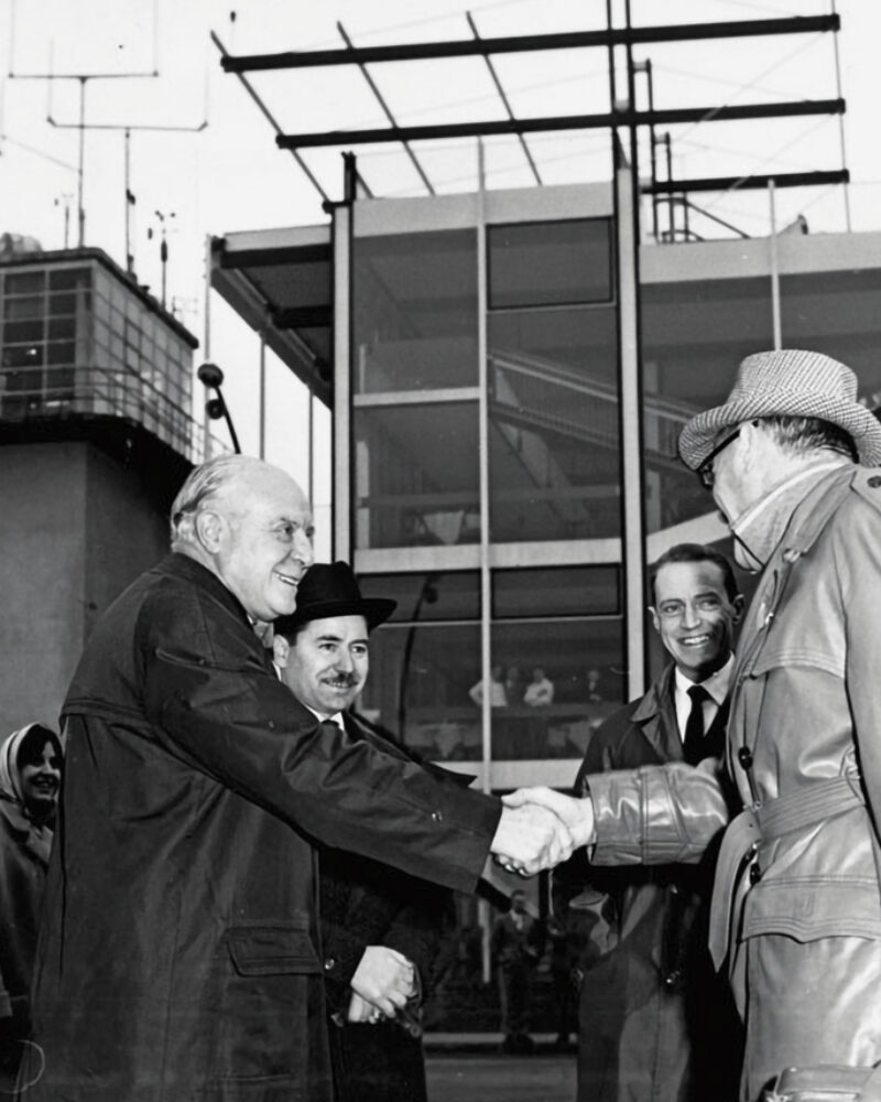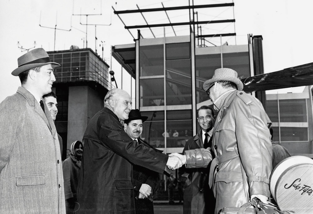 Livio Castiglioni meets Giò Ponti upon arrival at the airport, in a moment of exchange between two protagonists of twentieth-century Italian design culture. In the background, the rationalist architecture of the terminal reinforces the scene as a document of an era of dialogue between design, industry, and vision.