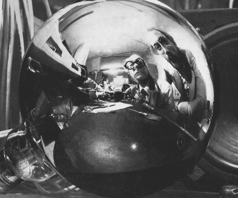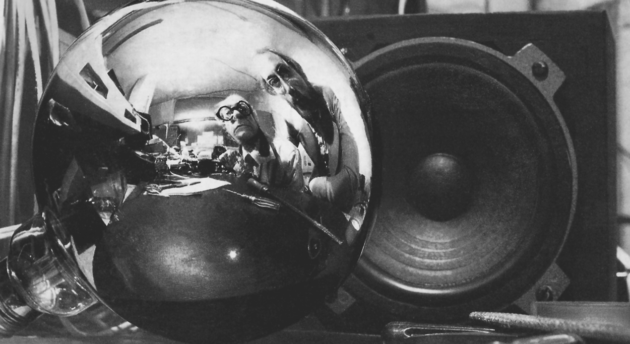 1975: Livio and Piero Castiglioni in their studio at Via Presolana 5, Milan. Reflected in the mirrored surface of a lamp, father and son appear immersed in the heart of their experimental laboratory, surrounded by instruments, sources, and speakers.
