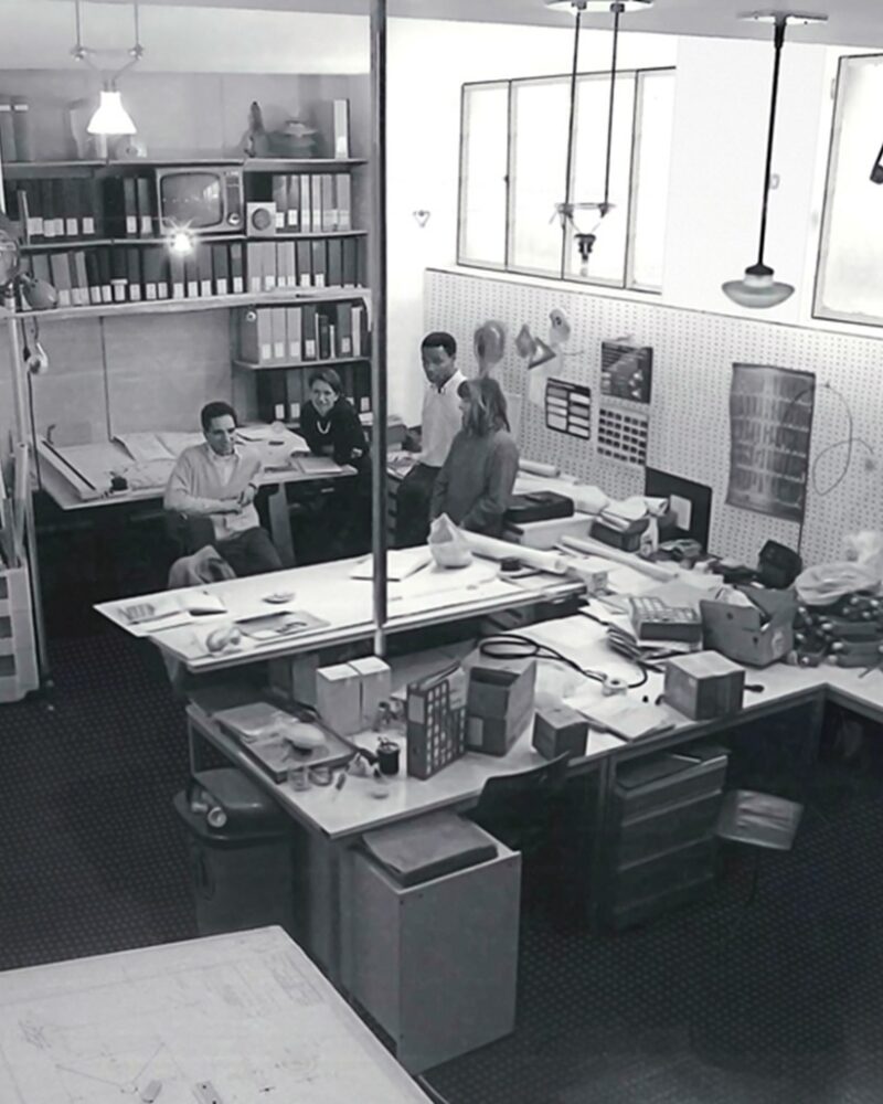 It is in this climate of intense industriousness that one of the studio's most emblematic atmospheres was born: a disciplined and monastic place, described years later by Massimo Vignelli, then a young collaborator. He remembered Livio isolated in a side room, intent on listening to radio signals through headphones, surrounded by his instruments; while Achille and Pier Giacomo, seated at the large drawing table, enthusiastically and humorously discussed their ideas. The space was illuminated by white enameled industrial lamps and dominated by Lips Vago bookcases overflowing with prototypes and materials: among them, the Phonola radio, now a symbol of Italian style, and the legendary Moretti camp chairs.